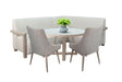 Bring comfort and casual elegance to your dining space with this corner nook set, thoughtfully designed for style and functionality. Featuring a space-saving L-shaped bench with plush upholstered seating, this set offers a cozy spot for everyday meals, coffee breaks, or casual conversations. The round dining table boasts a weathered finish that complements the clean, modern lines of the matching dining chairs. Neutral tones and soft textures make this set a versatile choice for contemporary, coastal, or farmhouse-inspired interiors. Whether you're outfitting a breakfast nook or optimizing a small kitchen, this set delivers charm, comfort, and practical appeal.