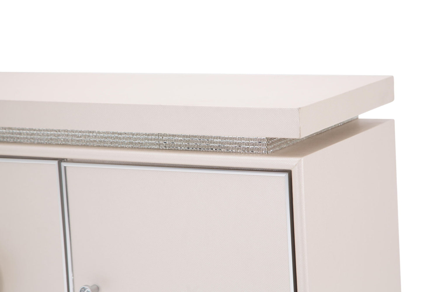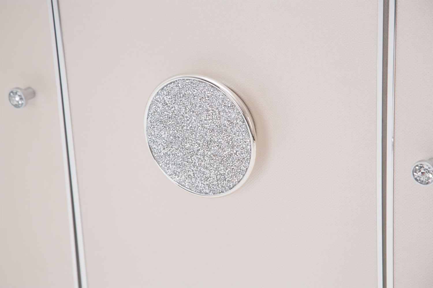 The sideboard features a stainless steel medallion as the focal design element, with crushed crystallized facets. Cabinets are framed with stainless steel and the piece is fully upholstered with high quality textured vinyl in ivory.