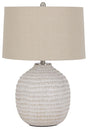 Style and function come together in this textured ceramic lamp. Combining a rounded base, with goldtone hardware, it's capped off with a simple natural lampshade for complete elegance. Pair this lamp with a wide variety of furniture styles to bring incandescent style to any space.