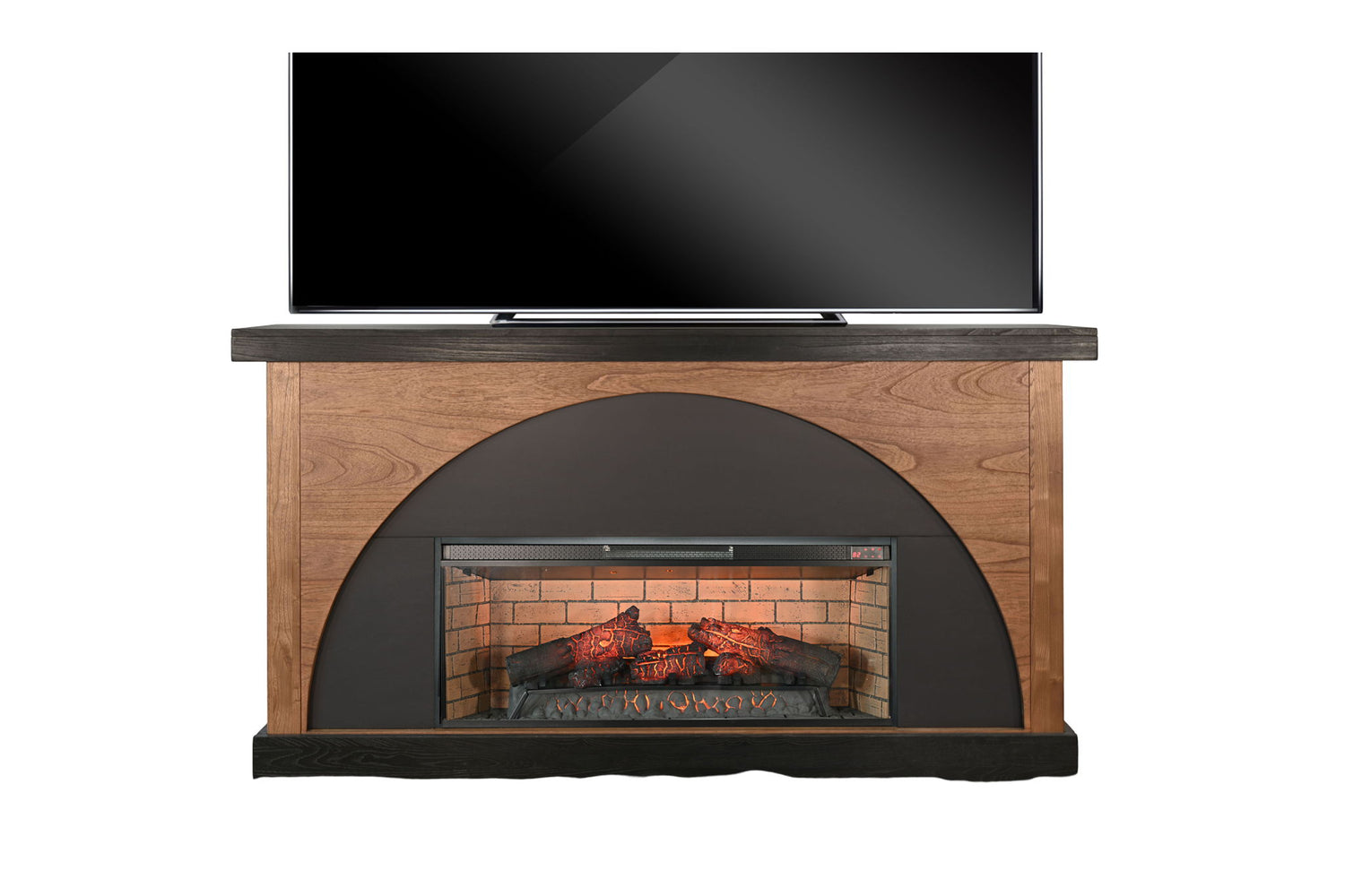 Striking and sophisticated, the Modern Arch Electric Fireplace Console adds warmth and style to any space. Featuring a bold black arch set against a natural wood backdrop with a deep black top and base, this piece blends architectural drama with modern minimalism. The built-in electric fireplace delivers ambient LED flames and supplemental heat with adjustable settings, creating a cozy atmosphere at the touch of a button. Whether used in a living room, bedroom, or media space, it makes a statement while providing practical comfort.