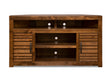 • Dimensions: 52 in. wide x 29 in. tall x 16 in. deep|Middle Shelf Dimensions: 23 1/4 in. wide x 15 in. deep. The Height between the shelves is 7 in. |Two door dimensions: 11 in. wide x 16 in. high |Fixed shelves dimensions: 10 in. wide |Soundbar shelf dimensions: 46 in. wide x 5 in. tall |Made of Knotty Alder Wood and Veneers|Made of Knotty Alder Wood and Veneers|Holds up to a 65 in. Television |||