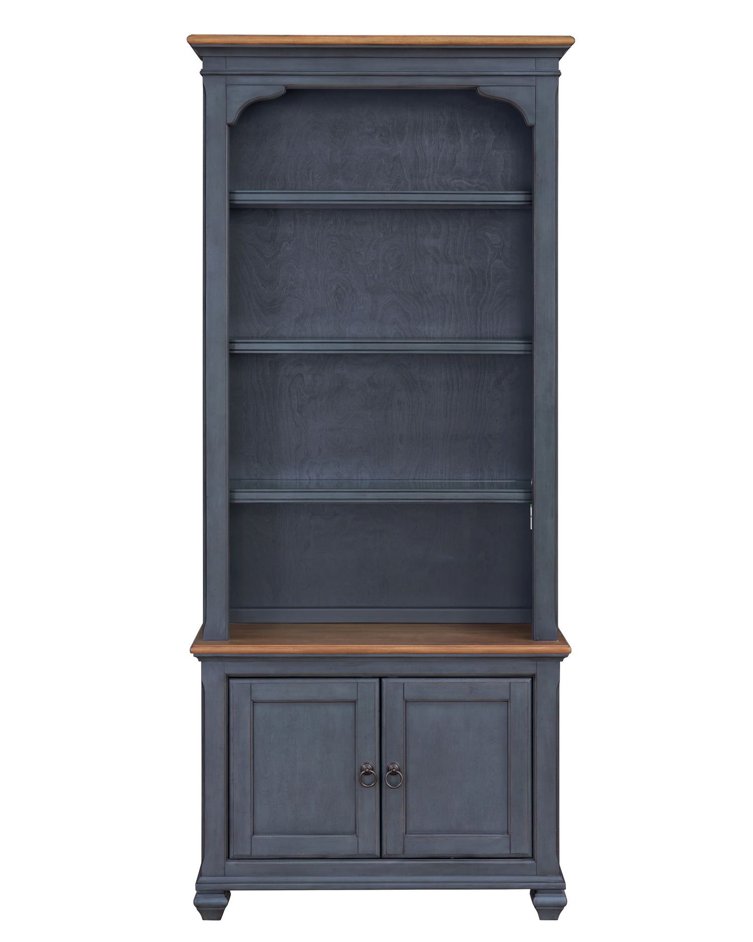 The Americana 84 inch Bookcase boasts a refreshing coastal twist on traditional style. Skillfully crafted from Rubberwood Solids and Birch Veneers, the subtle distressing, Corduroy Blue finish and Antique Pewter hardware give this Bookshelf Cabinet an updated look with a timeless heirloom feel. Featuring four shelves and two panel doors, this versatile Bookcase is ideal to showcase your book collection and home décor or store home office essentials. Just like Baseball, Apple Pie and Rock & Roll, the Americana Bookcase will become a beloved favorite in your home. Fully assembled upon arrival, this piece from Bridgevine Home is ready to unbox and enjoy.