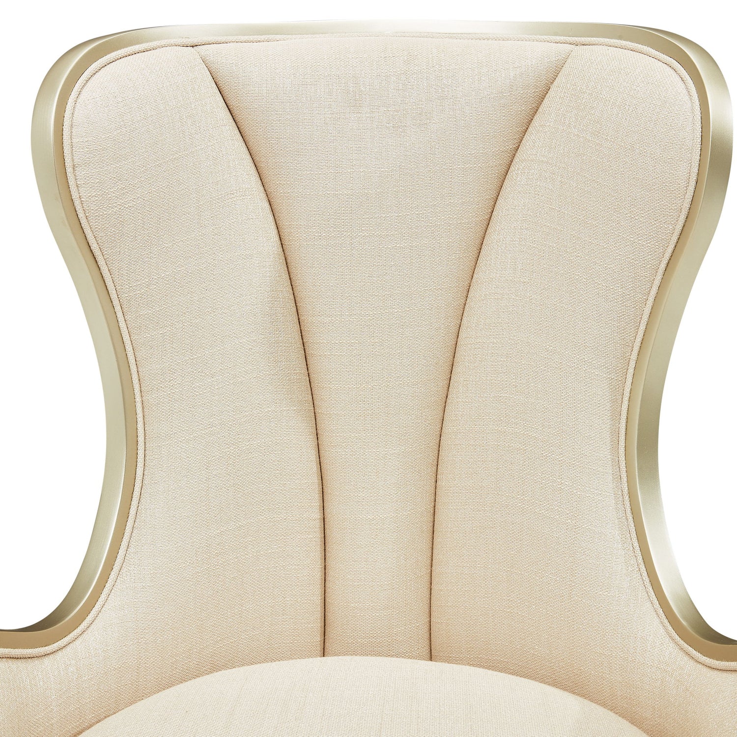 Post up at the home office looking fresh and elegant! The Villa Cherie Desk Chair evokes a soft hourglass shape that looks stunning at every angle. With champagne trims, a channel tufted backrest and splayed legs, this chair will to redefine your productivity.