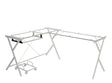 Corner Computer Desk Orientation: "L" ShapeX-Shape Metal Frame BaseRectangular Table Top w/Tempered GlassKey Board Tray IncludedComputer Holder Included