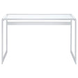 Achieve a sleek and modern workspace with this glass writing desk, perfect for home or commercial office settings. The spacious clear tempered glass top offers a minimalist aesthetic while providing ample room for work, design, or brainstorming sessions. Supported by a sturdy chrome metal frame, this desk ensures stability and durability while enhancing contemporary interiors. Whether used for professional tasks or creative projects, this stylish desk brings both form and function to any workspace.
