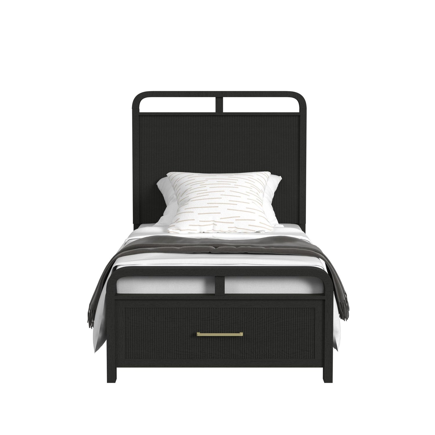 Anchor your bedroom's décor with the bold, sleek style of the Ridgemont Storage Bed. Featuring a versatile, finish with wood grain detailing, this bed exudes refinement and charm. The gently rounded edges offer a soft, modern aesthetic, and decorative fluting adds texture and artfully sophisticated flair. Furthering visual appeal, the striking geometric cutouts on both the head- and footboard create an open, inviting essence, while the footboard's convenient storage drawers streamline organization. With its smooth and minimalist lines, the Ridgemont Storage Bed is a perfectly elegant centerpiece for a modern bedroom.