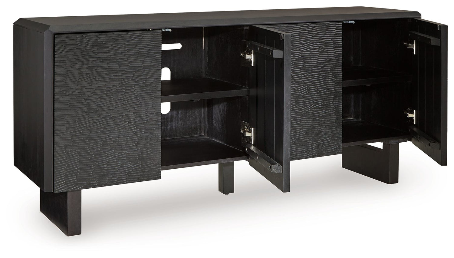 Function and style merge perfectly with this accent cabinet. Crafted of solid wood in a black finish, this piece makes a great case for fresh contemporary design. Doors with a carved pattern open to reveal shelving, while beveled edges add a distinctive touch. Whether you use it for storage or as a TV stand, your love of unique style will shine front and center.