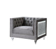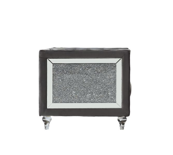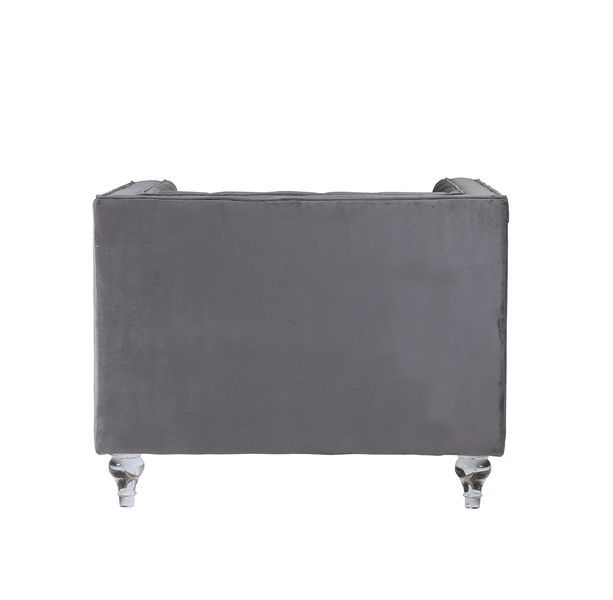 Impressive and bold, the Heiberoll living room collection is sure to impress your guests. The set includes mirrored side trim with faux diamonds to add a glimmering touch. The whimsical acrylic turned legs give off the illusion that the pieces are floating. The collection is upholstered in a plush velvet that feels silken to the touch. Ultra-comfortable seats and a sturdy wooden inner frame make this piece a joy to lounge on. Classic nailhead trim and button tufting finish off this glamorous set. Available in two colors pink and gray.