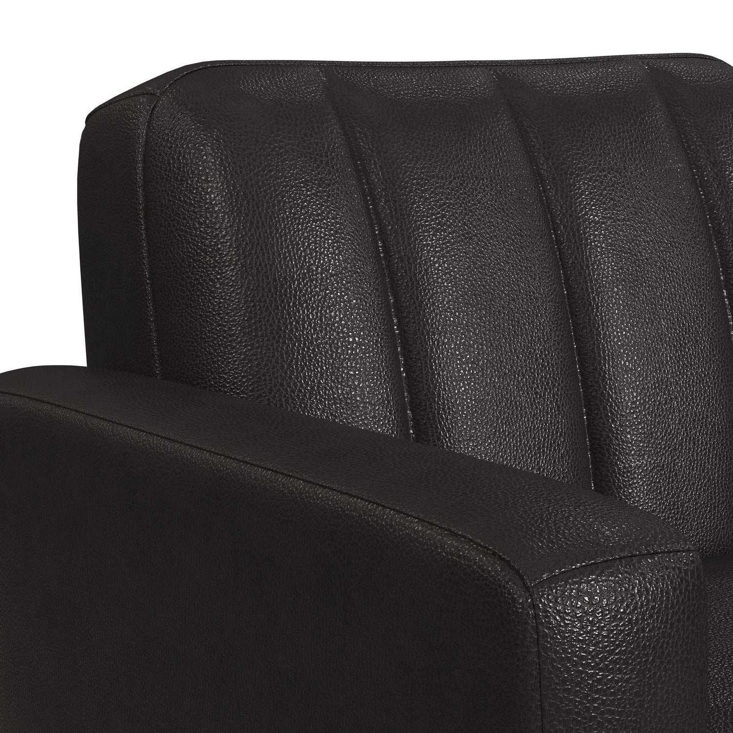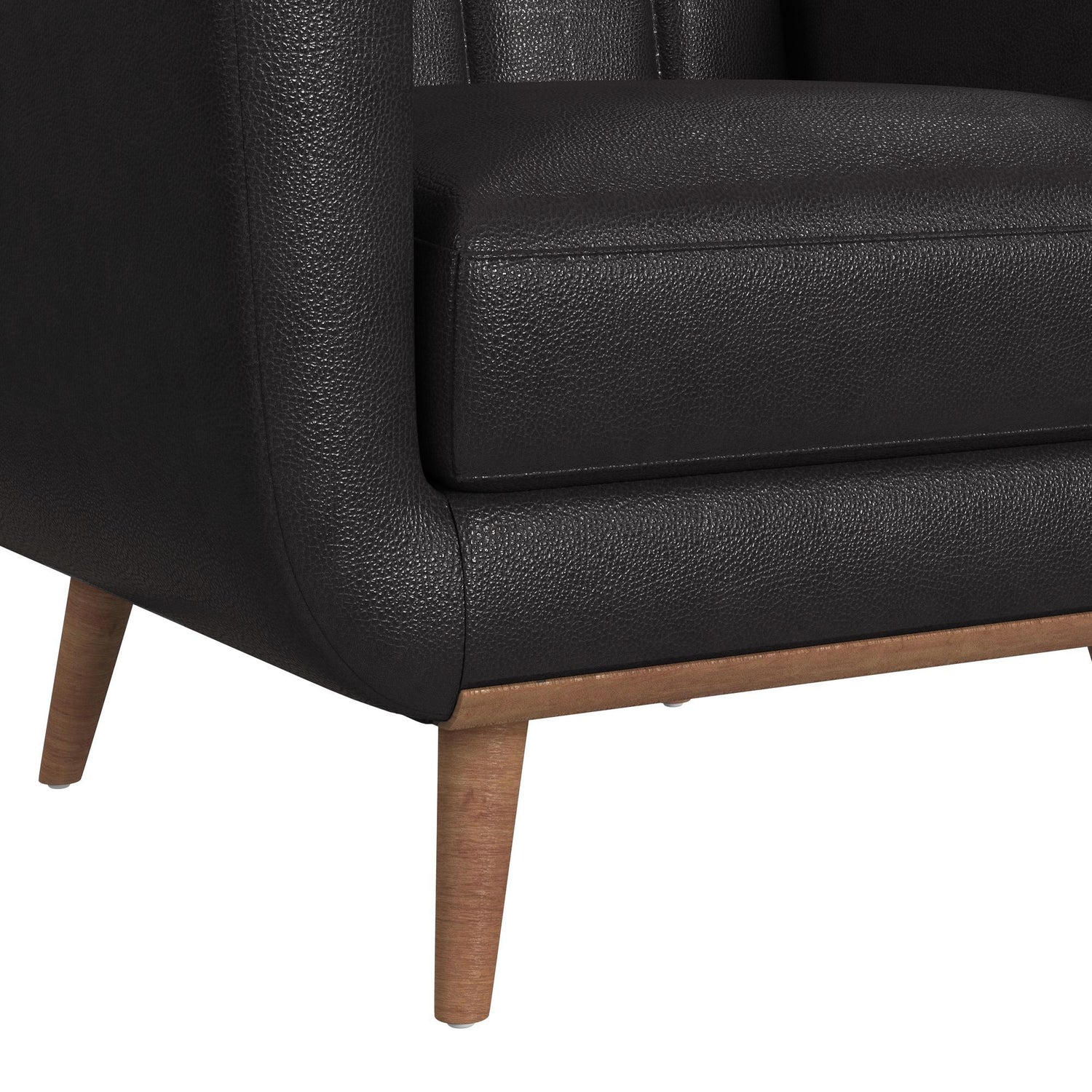 The Horizon Chair with Wood Front exudes the coveted charm of mid-century modern style. Built with a frame fully upholstered in quality faux leather, this piece is built for durability. Comfortable foam cushioning, decorative tufting on the backrest, and track arms forming sleek and modern lines culminate to mark thoughtful design, while an exposed front rail and wood legs highlight excellent craftsmanship. For a refined and sleek addition to your living space, the Horizon Chair with Wood Front delivers in quality and style.