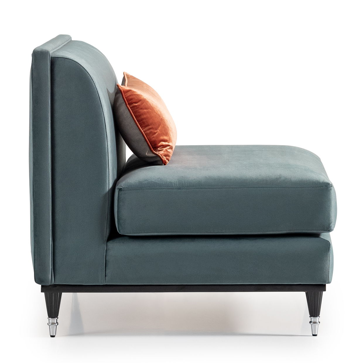Dressed in sumptuous velvet, this chic piece is accentuated by a single sunset velvet oblong pillow, adding a dash of warmth to its sophisticated charm. Whether you choose to create a larger seating area by pairing it with additional armless chairs or let it shine as a stand-alone statement piece in any room, this elegant chair offers boundless possibilities to elevate your space.