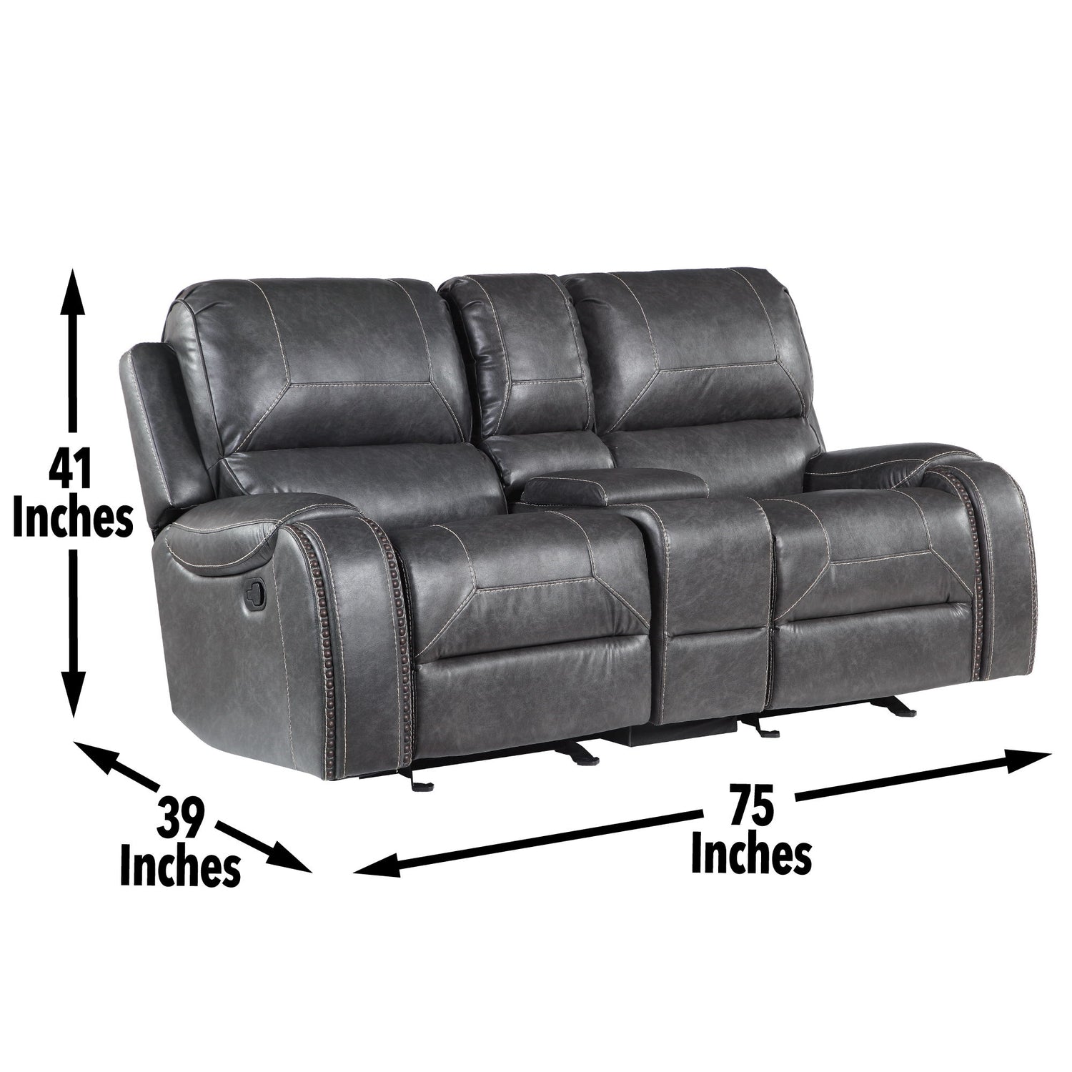 Superior comfort and style are the hallmarks of this motion set. Featuring a leather-like cover with baseball stitching, this ensemble comes with a Sofa with a drop-down console & USB charging station; a Loveseat with dual rocker/recliner ends; and a rocker/recliner Chair with 360-degree swivel. Antiqued brass nailhead trim and padded arms complete this ultimate motion package.