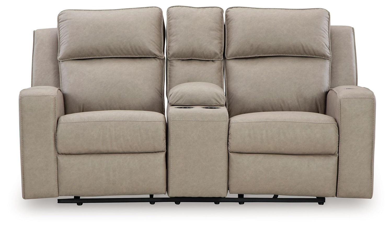 Indulge your lust for comfort and love for contemporary design with this reclining loveseat. Made for easy everyday living, it’s upholstered in a heavyweight padded faux leather and accented with contrast jumbo stitching for fashion-forward flair. Sleek track arms elevate the look with a touch of modern sensibility. A padded center console with dual cup holders completes the experience.