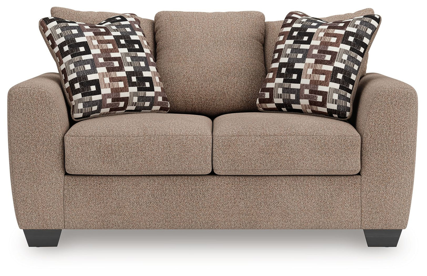 Transitional and right on trend. This loveseat's upholstery is a delightful change from the ordinary, with hints of soft brown giving the gray hue added depth. It’s punctuated with chic accent pillows in an eye-catching, stylized stripe design. Whether you're hosting friends and family or relaxing solo, this loveseat invites homey, comfortable character into your space.