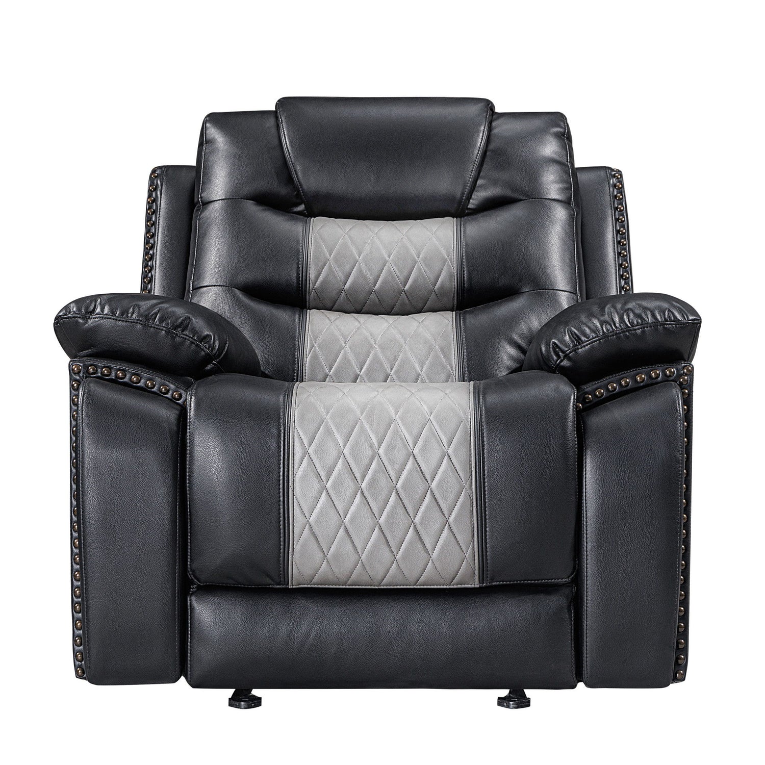 Experience unparalleled comfort with the Nikko Glider Recliner with Hidden Cup Holders . This recliner is built with long-lasting construction, featuring frames crafted from hardwoods and plywood for a stable and durable seating experience. Enjoy luxurious seating with resilient foam cushions and pocket coil support, offering a cozy place to lounge. The two-tone fabric, made from 80% polyester and 20% PU, provides the soft touch and look of leather with added breathability. Distinctive details such as nailhead trim, diamond stitch pattern seats, double wrapped headrests, and expert tailoring make this recliner a standout addition to any home. Practical lifestyle features include conveniently placed hidden cupholders in discreet pullout compartments under the armrests. The glider recliner offers soothing, gentle gliding action, plush pillowed arm and headrests, reclining backs, and comfortable footrests, providing the ultimate place to unwind. Enjoy unparalleled comfort and style in your home with the Nikko Recliner.