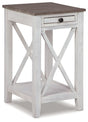 Modern meets vintage in this accent table. Made of wood, it creates a vintage vibe with a distressed white and gray finish and crossbuck supports on two sides. Two USB charging ports add modern function. This is a must-have piece for your living space.