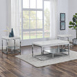 Bring a touch of elegance and sophistication to your living room with Aston, a 3-piece living room table set that exudes romantic charm. The modern sled base and asymmetrical design with an offset smoky glass shelf make for a striking centerpiece, while the sparkling chrome base and lustrous white marble create an aura of timeless beauty. Perfect for intimate conversations and candlelit dinners, Aston will make your heart skip a beat with its clean lines and contemporary appeal. Set the mood for a truly special evening with the Aston living room table set.