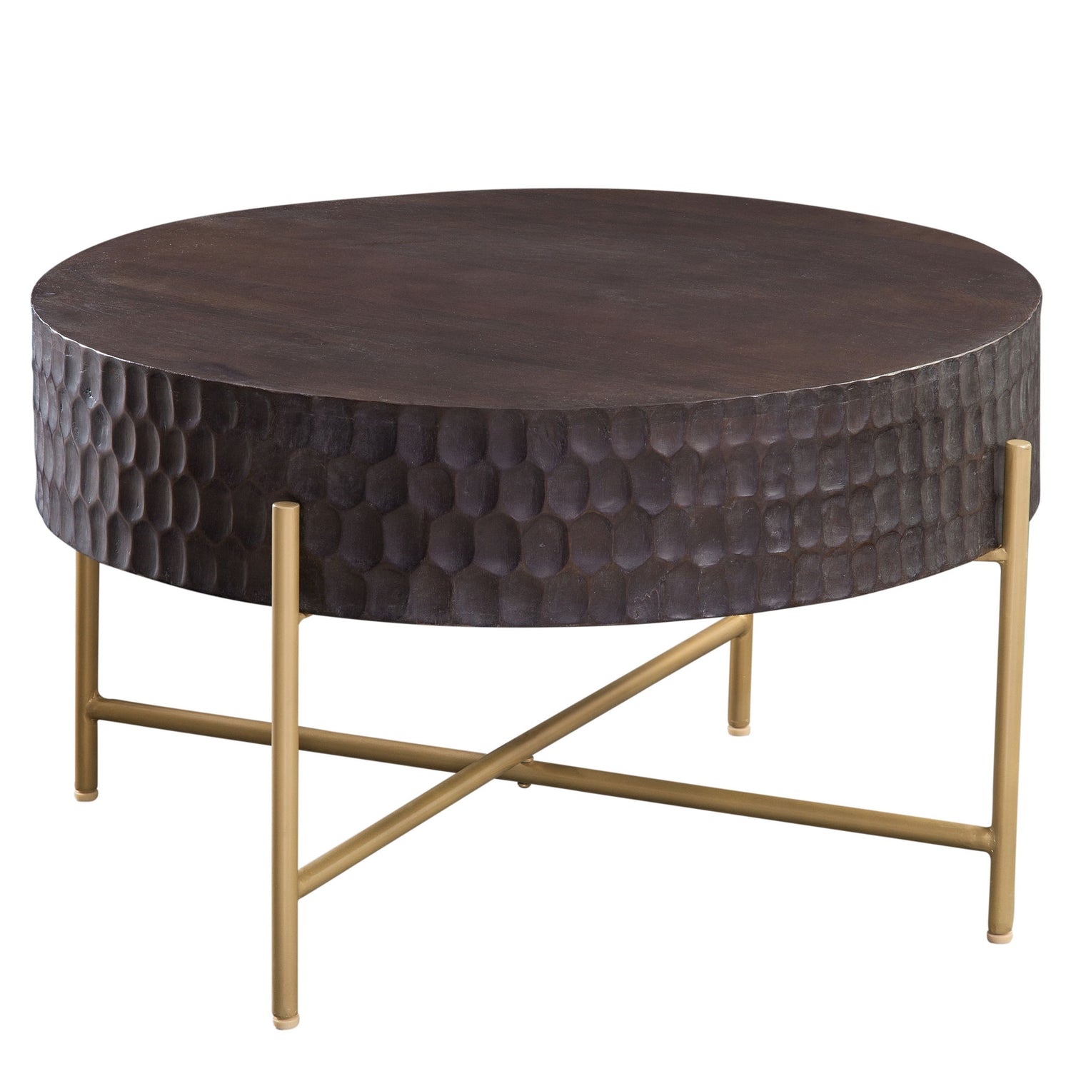 The Bobbi Table combines artisanal texture with modern sophistication. Crafted from solid mango wood, its hand-sculpted honeycomb sides highlight the natural grain, finished in a rich burnished espresso. A matte brass iron base adds bold contrast and features a cross-stretchered design for stability. The powder-coated metal resists wear, while kiln-dried wood minimizes cracking or warping over time.