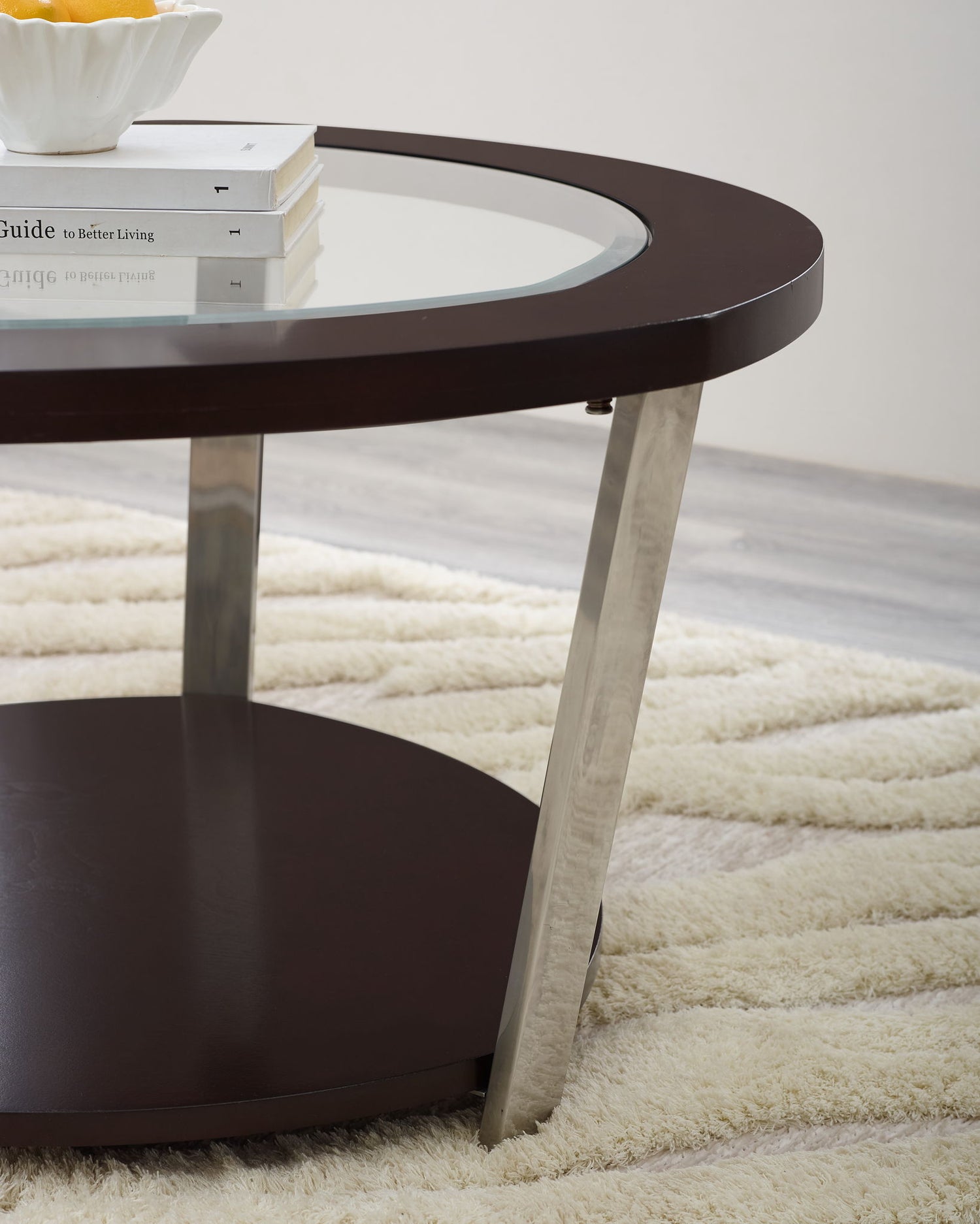 A contemporary styled occasional Cocktail Table of stainless steel, wood and glass construction, Duncan features a spherical triangular shaped top that will instantly add interest to any room. A rich mixture of elements and espresso finish combine for a sophisticated modern look.