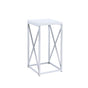 This the modern accent table oozes luxury and offers a sophisticated update to a simple silhouette. Decorated with X-shape details, the base is constructed of sleek lines in a bright, metallic finish. Dress up any living or sitting area with the crisp and glossy white finish of the square top. Create an open feel with the airy legs and shiny hues, perfect for adding depth. Display your favorite vase in style over cross hatched details.