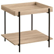 Offer a casual ambiance to your living room gathering space with a modern farmhouse table, constructed from metal and engineered wood. It showcases a light wood grain finish, creating a sense of dimension while maintaining neutral versatility. The tabletop is rectangular, with a tray-like top that adds detail and natural wood-like features. A minimal metal framework receives a black finish and offers structure and support. Underneath, a full, flat lower shelf provides convenient storage or display space for books and decor, lending personalized appeal to your living room.