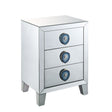 Assambled, Rectangular Night Table • Mirrored Finish: Beveled (Back Unfinished) • Orientation: Free Standing • Storage: 3 Drawers (Open Base) •• CONSTRUCTION •• Mirrored Case-Frame & Drw: Mirror, MDF (Fixed Top) • Mirrored Tapered Leg, Leg Size: 4 Inches Height •• Drawer: GLIDE Side Metal (Ext. 2/3), Dovetail French Front, Felt-Lined Not Included, Safety Stop Not Included, Manual Close, Hardware: Faux Agate, Single Knob, Drawer Size: 13" x 12" x 5"H