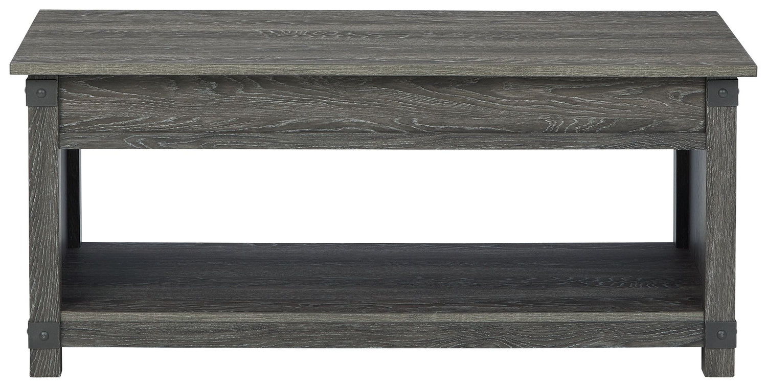 Open the door to modern farmhouse style with this lift-top coffee table. The beautiful woodgrain look and classic crossbuck metal accents are a cool touch, while the lower shelf provides surface space for fashionable home accessories. Sporting a gray replicated wood grain effect, its handy spring-loaded mechanism brings the tabletop closer to you. This versatile table makes it easier than ever to eat, work or play from the comfort of your sofa.