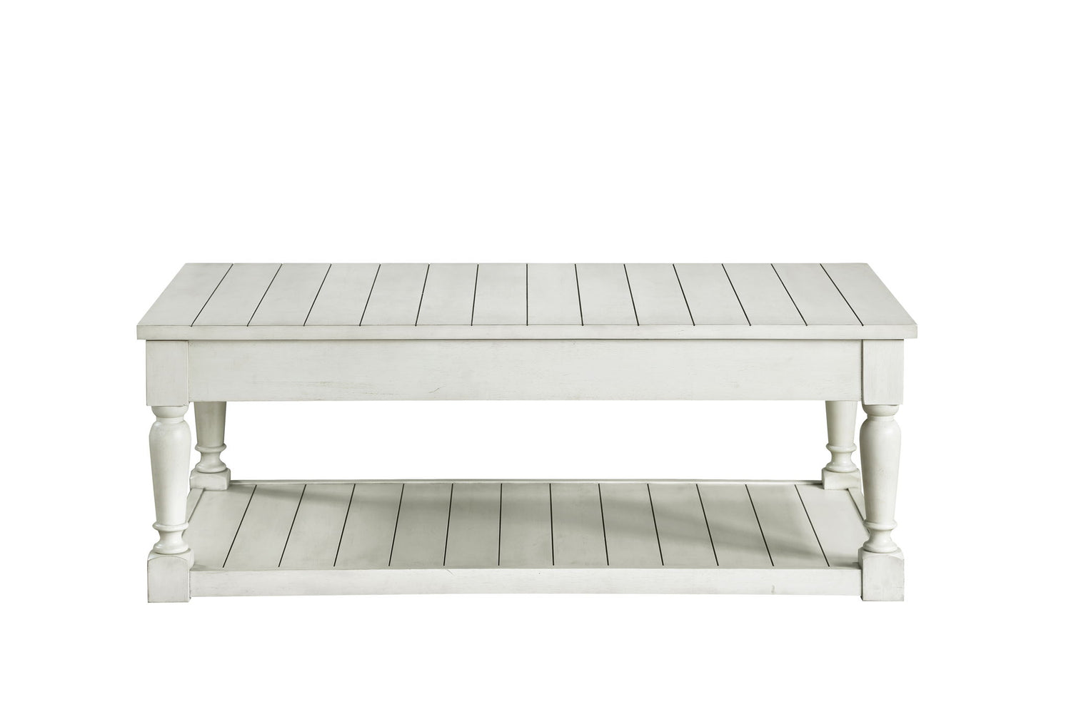 • Styling details include cottage styling, plank effect on top and bottom shelf, turned legs and Lift-Top