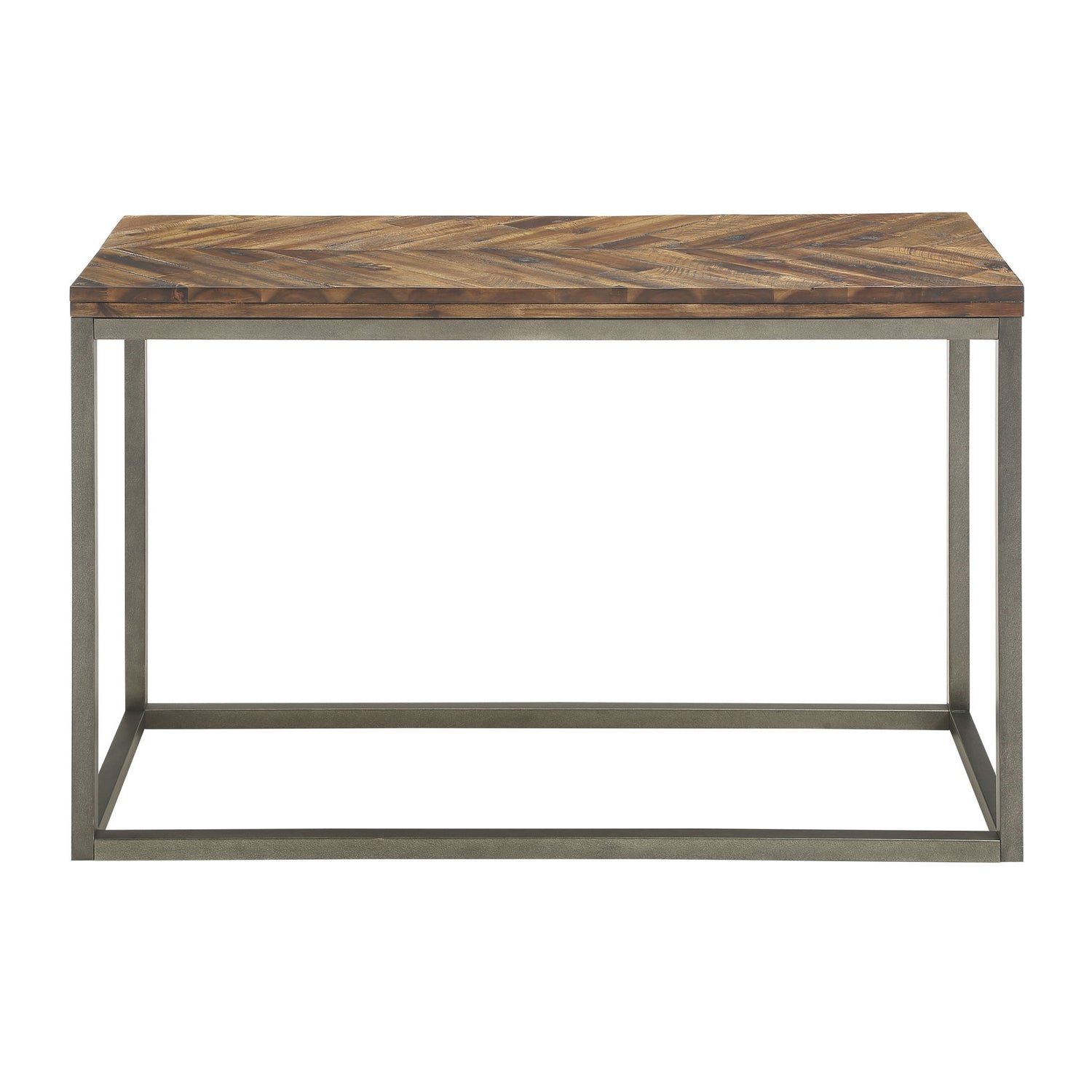 Lorenza presents rustic elegance in a set of occasional tables. This collection of cocktail, end and sofa table can be paired to fit your living space to deliver both functionality and style to any room. The fashion-forward sled style metal base pairs beautifully with the heavily distressed chevron-patterned smoky honey top to delivery a vintage feel comfortable with any casual style.