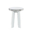 This mirrored and faux crystals Lotus occasional table is an alluring focal piece. Masterfully crafted with a wooden frame and beveled mirrored finish for durable construction. The mirrored splayed legs help give your space an open feeling. The faux crystal apron inlay is the perfect touch of chic to the round table top. The mirrored finish ensures that it fits in with any decor and color scheme.