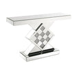 The modern glamour of the Noralie mirrored console table will brighten your foyer or bedroom. This brilliant console table features a mirrored pedestal base with faux diamond inlay, adding dimension, contrast, and shine to this functional piece. It features a sturdy 3mm beveled mirrored top that can be used for display or function. The gleaming console table will reflect the perfect amount of light into any dark space.