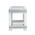 This piece strikes a sleek, clean-lined silhouette trimmed with faux diamonds and mirrors. Adding depth and dimension to your room while upping the wow factor in your home. This Noralie end table is ideal for displaying your precious family photos and heirlooms. The clear glass top allows light to flow right through to the bottom mirrored shelf. A matching coffee table is available.