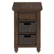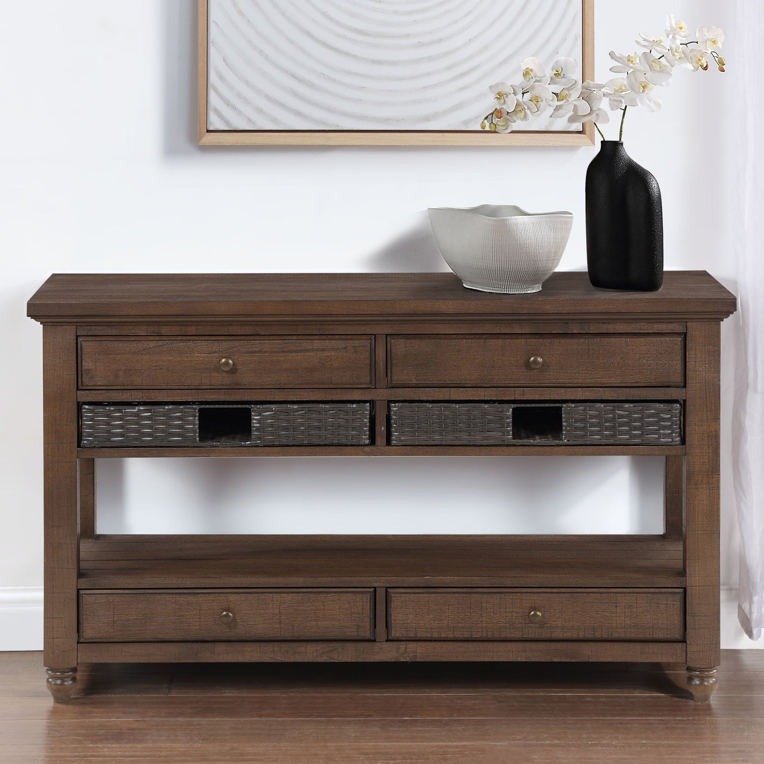 A wonderful addition to a hallway or living space, the Oliver Table boasts boundless storage possibilities with drawers and removeable baskets. This table combines farmhouse charm with classic styling seamlessly, boasting full drawers and removable baskets, . The finish infuses warmth into its aesthetic, while details like the turned bun foot, plank top, and waterfall edge enhance its visual appeal.