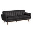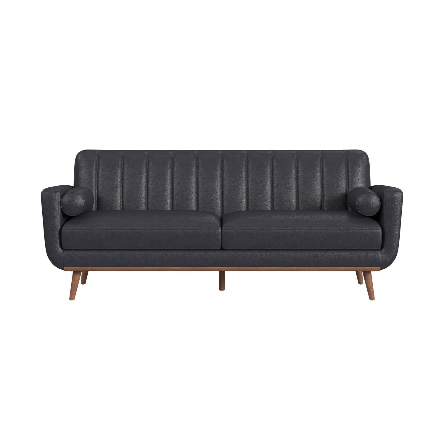 The Horizon Sofa with Wood Front and 2 Six Inch Bolster Pillows exudes the coveted charm of mid-century modern style. Built with a frame fully upholstered in quality faux leather, this piece is built for durability. Comfortable foam cushioning, decorative tufting on the backrest, and track arms forming sleek and modern lines culminate to mark thoughtful design, while an exposed front rail and wood legs highlight excellent craftsmanship. For a refined and sleek addition to your living space, the Horizon Sofa with Wood Front delivers in quality and style.