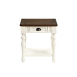 Add farmhouse charm to your living area with the Joanna End Table. Gracefully turned legs combine with a two-tone ivory and mocha finish for an inviting look that works well with any farmhouse or cottage upholstery. A working drawer with half-moon nickel hardware adds hidden storage to any room while the units's bottom shelf adds storage and/or display area. Matching Sofa Bar and dining sets are available from this comprehensive farmhouse collection.