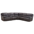 Fill the entire room with the reclining comfort of the Plaza sectional. This power sectional is large enough to seat all your family and friends with enough power options for everyone to enjoy. Revel with friends in the comfort of the extra wide seating and extra wide arms. The power footrest operates with the touch of a button and the smoke grey fabric looks like suede and blends well with many decors.