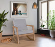 This item is a contemporary rocking chair that combines comfort with a stylish, modern design. The chair features a light wood frame with clean, geometric lines that provide both support and aesthetic appeal. The backrest and seat are upholstered in a soft, gray fabric, offering a neutral tone that complements various interior decors. The gentle rocking motion is perfect for relaxation, making it an ideal addition to living rooms, nurseries, or reading nooks.
