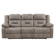 The Abilene Drop-Down Console reclining sofa combines convenience and comfort beautifully in a modern reclining design. Featuring a a convenient drop-down console with a work surface, this Sofa features two stainless steel cupholders, and a storage pouch for organizing your remotes, electronics, and other essentials. A stylish and elegant design is combined with a tan microsuede cover and dark olive side panels. Besides being beautiful, the Abilene is extremely comfortable as well. This sofa features overstuffed arms, a supportive headrest, and a dimpled back for the perfect combination of comfort and relaxation. It reclines effortlessly with the pull of a side lever for the ultimate in comfort..