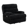Let the Admiral Motion Recliner in Masis Black cradle you in unprecedented comfort. Upholstered in a plush, ribbed fabric and filled with supportive cushioning, this piece is made to enrich even your longest moments of repose. Manual reclining functionality enhances relaxation, while padded pillow top armrests are ideal for lounging. The versatile and sleek black finish pairs well with various decor styles and is forgiving to staining, while framing of quality engineered wood enhances durability. For a piece as versatile as it is comfortable, outfit your living space with the Admiral Motion Recliner in Masis Black.