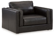 Keen on crisp, contemporary design? Adore the pleasure of leather? Look no further. This oversized chair satisfies on every level. Richly textured and decadently supple, the plush cushions are wrapped with expertly matched leather and faux leather upholstery in an on-trend onyx tone. Sleek double-padded arms and a low, clean-lined profile complete the chair's simply chic appeal.