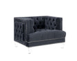 Sophistication meets modern with the Ansario living room collection. The rich blue velvet adds character to any room. Showcasing a square back, high arms, and nail-head trim, feature button tufted accents. The acrylic legs give off a modern vibe to the pieces. The full foam seats ensure that your next TV binge will be done in complete comfort.