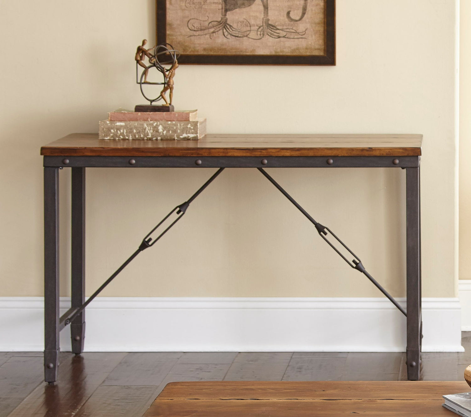 Take industrial design to a new level with the Ashford Sofa Table. The simulated plank top, riveted iron sides and industrial designed stretchers are combined for that restoration look without being bulky. Sturdily constructed using engineered hardwoods and pine veneers in a warm, antiqued honey finish. Also available in this collection (purchased separately) are the matching end table, cocktail table and chairside end table.