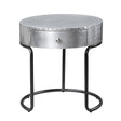 Assambled, Drum End Table Storage: 1 Drawer () Patchwork Aluminum Top/Drawer Metal Round Frame (Open) CONSTRUCTION Patchwork Aluminum Top/Drawer: Aluminum, Frame: Ply Metal Frame Base: Iron (Size 16"H)