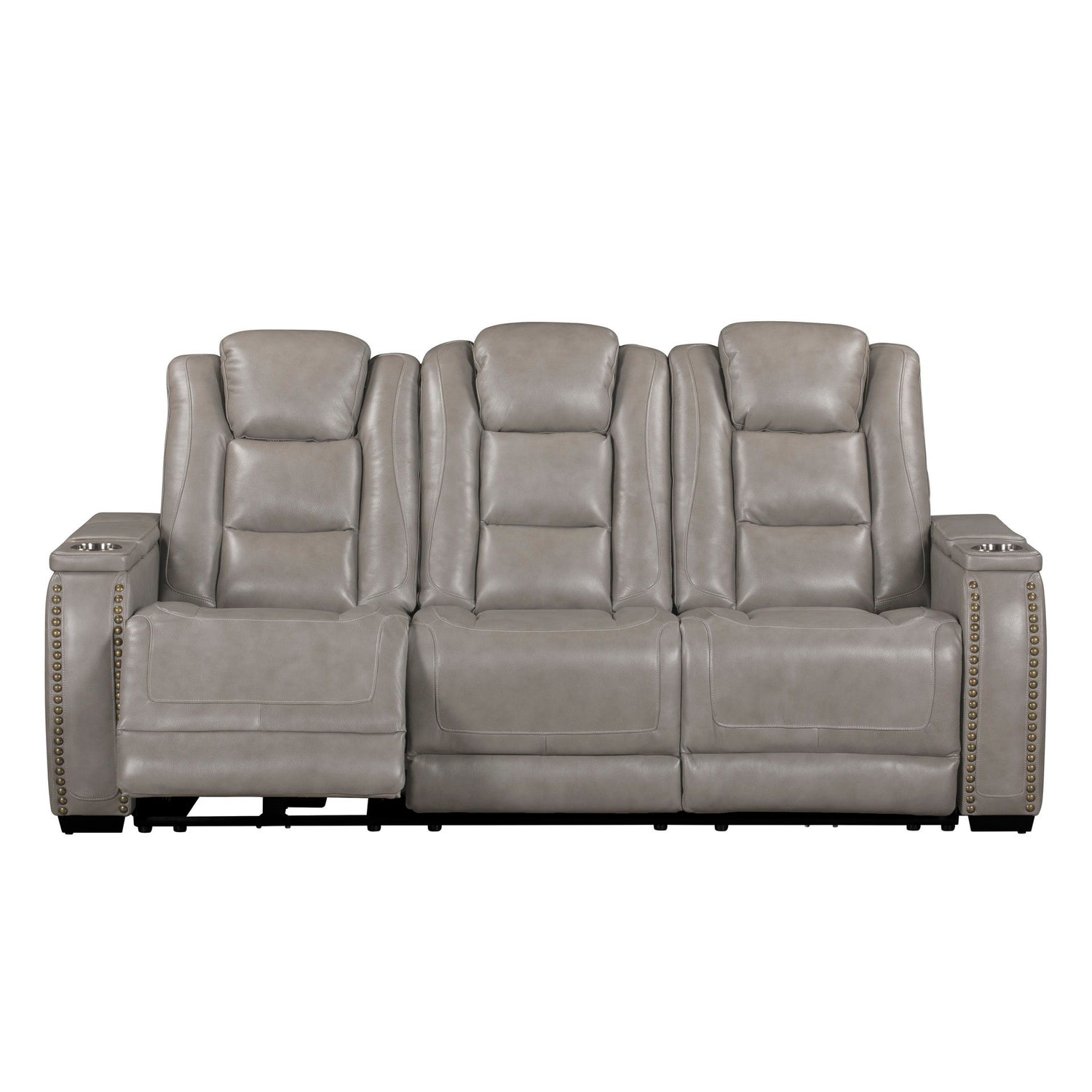 The Breckenridge Genuine Leather Reclining Sofa offers a perfect combination of luxury, durability, and modern convenience, making it an ideal centerpiece for your living space. This reclining sofa is crafted with a blend of hardwood and manufactured woods, ensuring a sturdy and durable frame that provides long-lasting support and reliability. The top-grain leather on the seats, arms, and footrests delivers a luxurious feel, while a matching leather-like material in less-touched areas keeps it affordable without compromising on style or comfort. The design features clean lines and elegant nailhead trim, blending traditional and contemporary elements for a refined, transitional look. Pocket coil seat cushions provide superior comfort with targeted support, minimizing pressure points for a tailored seating experience. The reclining seats allow you to easily find your perfect position for lounging or reading. This sofa is also packed with convenient features, including cupholders integrated into the armrests. Additionally, the sofa includes a drop-down tray, electrical outlets, and reading lights, making it a functional and stylish addition to any home.