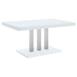 Sleek lines and smooth materials come together to create this ultra-modern dining table. Designed with a spacious rectangular top in a white high gloss finish that lends a polished, formal flair, this dining table offers up a chic style to formal entertaining spaces. Mirroring the top is a flush base, offering extra support and stability. With a pedestal-like design, the top and base come together with a trio of polished stainless steel supports in a lustrous and gleaming chrome finish. Place this dining table in a dining area for a jaw-dropping look.