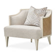 Enjoy the finer things in life with the Camden Court Accent Chair. This piece features trims finished in Platinum and stunning faux raw silk fabric that has a glamorous sheen to it. The curved chair back is designed with a bookmatched Silver Eucalyptus veneer pattern and a delicate V-notch on the top back rail. Every detail matters!