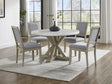 The 5-Piece Carena Dining Set is sure to elevate your dining experience. Centered by the stunning Carena Dining Table and flanked with the Carena Side Chairs, this set features a captivating 52-inch round white marble top resting on a rustic trestle base for the perfect complement of strength and style. A single timber-beam design ensures robust support for the elegant marble surface, accommodating comfortable seating for six in style . The sophisticated marble top beautifully contrasts with the casual wheat finish over the solid poplar wood trestle base, adding rustic beauty to your dining space. The accompanying Carena Side Chairs boast solid tapered wood legs and a chic modern silhouette, upholstered in gray polyester fabric for both style and comfort.