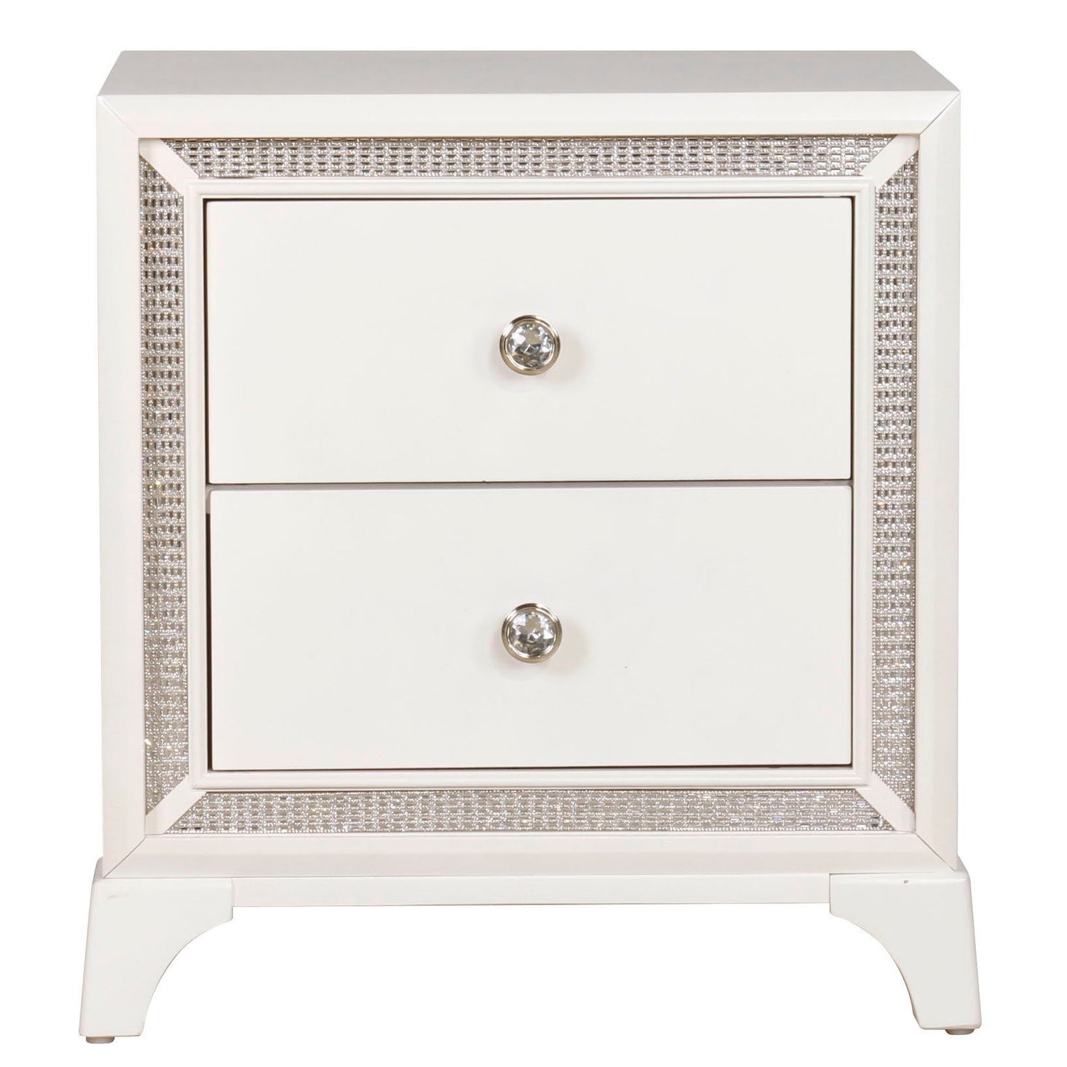 Bring a touch of ultra-glam to your space with the shimmering beauty of the Cassie 2-Drawer Nightstand. Its pearl finish and crystal-inlaid hardware exude sophistication, while the dazzling crystal border lights up with the flip of a switch, transforming the room with a soft, enchanting glow. Acting as both a stylish piece and a convenient night light, this nightstand seamlessly blends luxury with sparkle. The spacious two drawers offer ample storage with a felt-lined top drawer to protect delicates, making it the perfect balance of form and function. Ideal for those who want to elevate their bedroom with a touch of glamour.