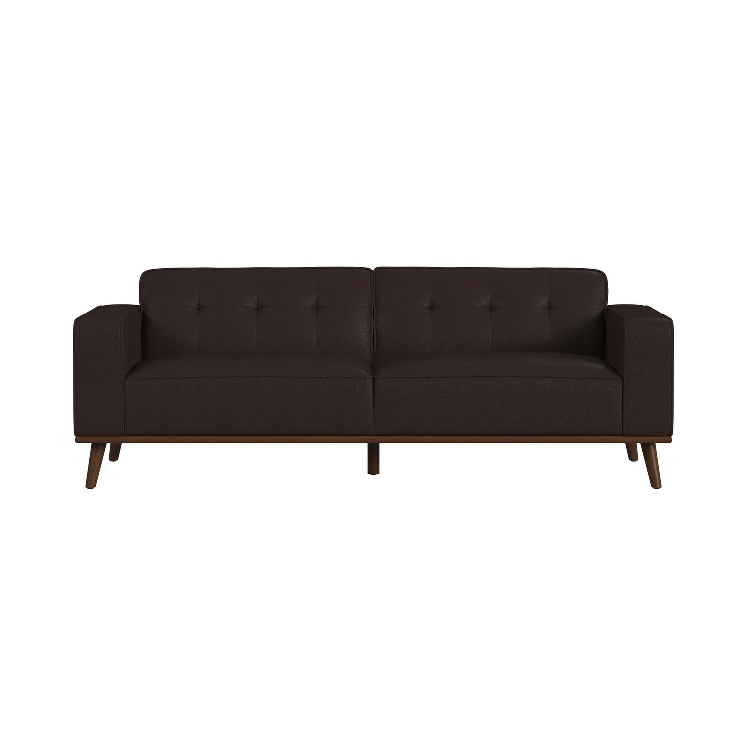 The Destiny Sofa with Wood Front exudes the coveted charm of mid-century modern style. Built with framing of quality solid and engineered wood that is full upholstered in quality faux leather, this piece is built for durability. Comfortable foam cushioning, decorative tufting on the backrest, and track arms forming sleek and modern lines culminate to mark thoughtful design, while an exposed front rail and wood legs highlight excellent craftsmanship. For a refined and sleek addition to your living space, the Destiny Sofa with Wood Front delivers in quality and style.