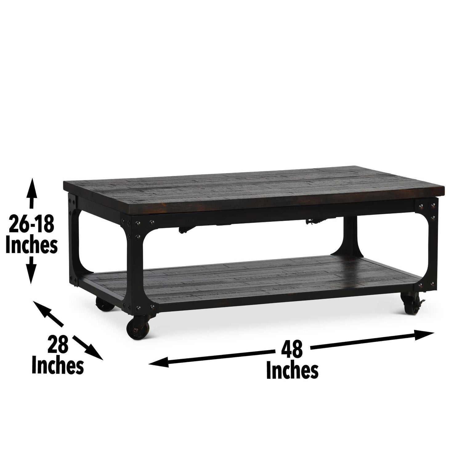 Sherlock presents rustic industrial styling in a lift-top cocktail set that will bring function to your living room tables. The highly distressed top and base of the tables give interesting character to the table while the metal structure adds an interesting mixed media component to the group. Four large locking casters give the Cocktail added mobility which pairs well with the matching End Table.