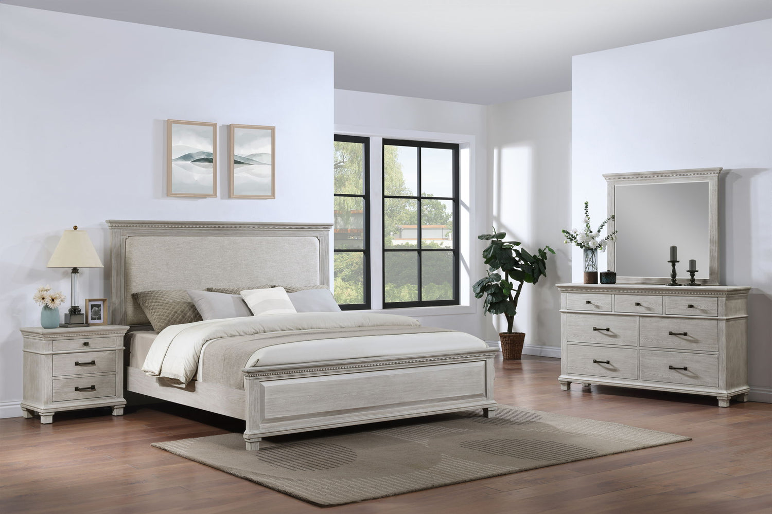 The Silver Sands Bedroom Set in Gray is the perfect choice for those seeking a combination of durability, style, and functionality. Each piece is crafted from solid pine, manufactured woods, and oak wood veneers, ensuring strong and stable construction. The transitional design features clean lines and a rustic wood finish, creating a calm and inviting atmosphere that complements any decor. The finish, hand-applied in multiple steps, highlights the natural grain and mineral patterns of the wood, offering a light, weathered look with a soft, slightly distressed appearance. The bed showcases an elegant design with a raised panel footboard and a plushly padded headboard, enhanced by dentil moldings and crown moldings for a sophisticated appeal.